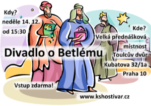 K mimořádným programům (i pro děti) jsme přidali vánoční divadlo (2014, scénář a kulisy Josefa Potfajová, režii Monika Kordulová). Přes náročný nácvik a výpravu se premiéra, kde účinkovali nejen dospělí se setkala s velkým úspěchem. Hru jsme reprízovali ještě v letech 2015 (Toulcův dvůr, reportáž is nahrávkou v článku Veselé Vánoce 2015 …) a 2016 (KD Varta).